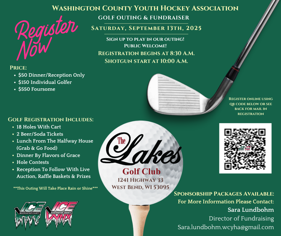 Registration is now open for the WCYHA Golf Outing on September 13th, 2025 at West Bend Lakes golf course. Consider joining for a round of golf; singles are $150 and a foursome is $550, lunch on the course and dinner included. If you are not a golfer you can still enjoy the event with the dinner only option. Raffles and auctions will happen throughout the event.